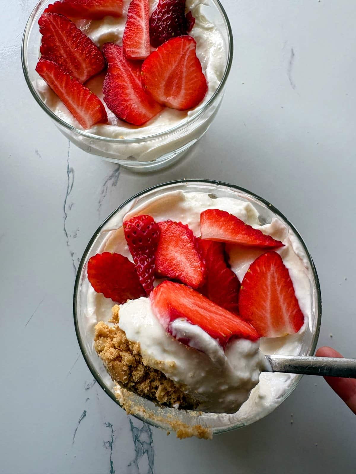 Συναρμολογούμε τα cheesecake μας: Σε κάθε δοχείο, θρυμματίζουμε 2 μπισκότα digestive και τα απλώνουμε στον πάτω. Στη συνέχεια, βάζουμε περίπου το 1/6 της κρέμας. Τέλος προσθέτουμε φρέσκιες φράουλες.